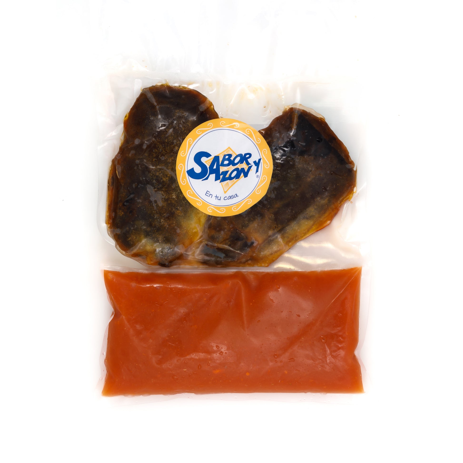 Una receta única: relleno de plátano y queso, bañada en caldillo de jitomate.